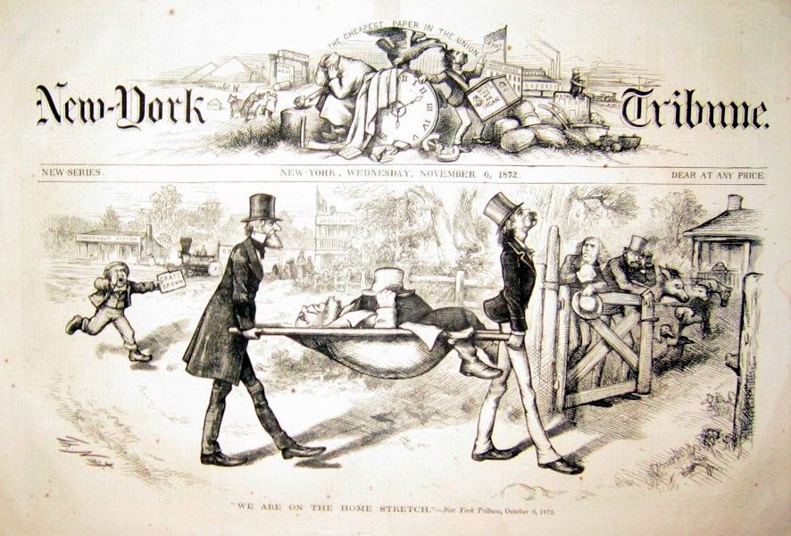 By the way here is the cartoon I mentioned above. I mis-remembered; it wasn't Greeley's funeral exactly, but suggesting he was near death. Greeley had run as a quixotic Democratic candidate in the 1872 election against President Ulysses S. Grant and his continued occupation of the South during the reconstruction period following the civil war. Greeley did poorly in the election, and this cartoon in Harper's Weekly, a strongly Republican magazine at that time, mocked his crusading style and suggested his campaign had no life left in it.